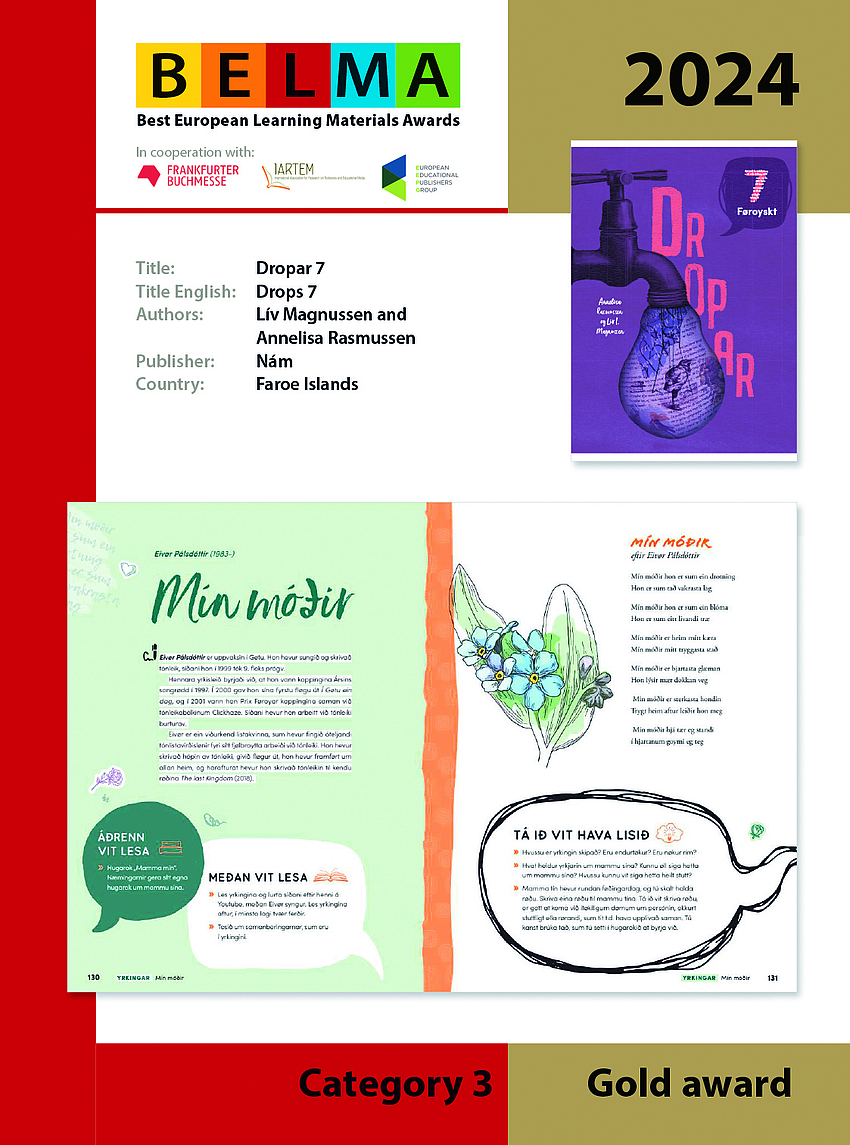 Nám fegnast um, at tað enn eina ferð er eydnast at vinna gull til eina av okkara útgávum. Hesaferð varð tað Dropar 7, lesibókin til 7. flokk, sum endaði á fyrstaplássinum í kappingini um bestu lærubókina til hádeild. Tað eru Lív Ingolfsdóttir og Annelisa Rasmussen, sum hava skrivað bókina.